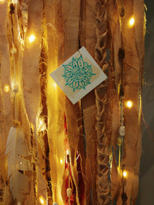 The next thing to do was add the remaining material to the bottom of the dream catcher. TO create a bit of texture I braided some of the strips. Also added in some knitting wool of different textures. I also added in fairly light to brighten up the piece. And lastly, I added in the feathers and the small drawings that I had created.